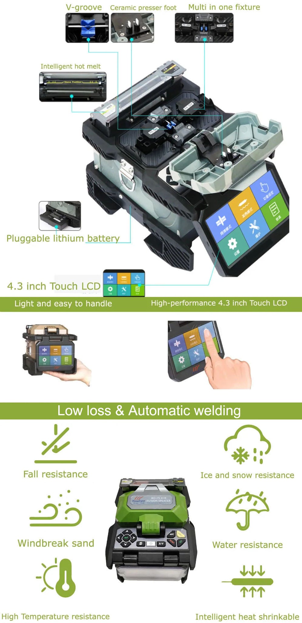 For the fiber optic fusion splicer The monitor is a touch screen delivers fresh designed graphical interfaces, which are simple for operation. The modular pluggable lithium-ion battery of large-capacity ensures long-time field operations. Another point of this optical fiber fusion splicer ,The auto environment compensation system greatly improves adaptability of the splicer to hostile environments, so that low-loss fiber optic splicing can be remained consistent in various enviroment.